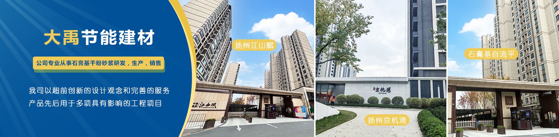 揚(yáng)州市大禹節(jié)能建材科技有限公司成立于2005年9月,位于聯(lián)合國宜居城市---江蘇省揚(yáng)州市,地處江都經(jīng)濟(jì)開發(fā)區(qū),與揚(yáng)、鎮(zhèn)、泰三市接壤,交通十分便捷。公司是專業(yè)從事石膏基干粉砂漿研發(fā),生產(chǎn),銷售一體化的綜合性科技型企業(yè),為國家標(biāo)準(zhǔn)GB/T2862-2012《抹灰石膏》的參編單位?! 」緭碛袊鴥?nèi)一流的特種砂漿生產(chǎn)線,并配有各種先進(jìn)的檢測儀器,年生產(chǎn)能力可達(dá)10萬噸。各崗位管理及技術(shù)人員齊備,對產(chǎn)品···